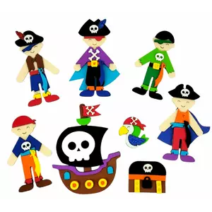 Набір для творчості 3D Аплікації Пірати складається з п`яти піратів ,корабля , скрині та папуги , на які потрібно наклеїти ( одягнути) яскраві предмети .