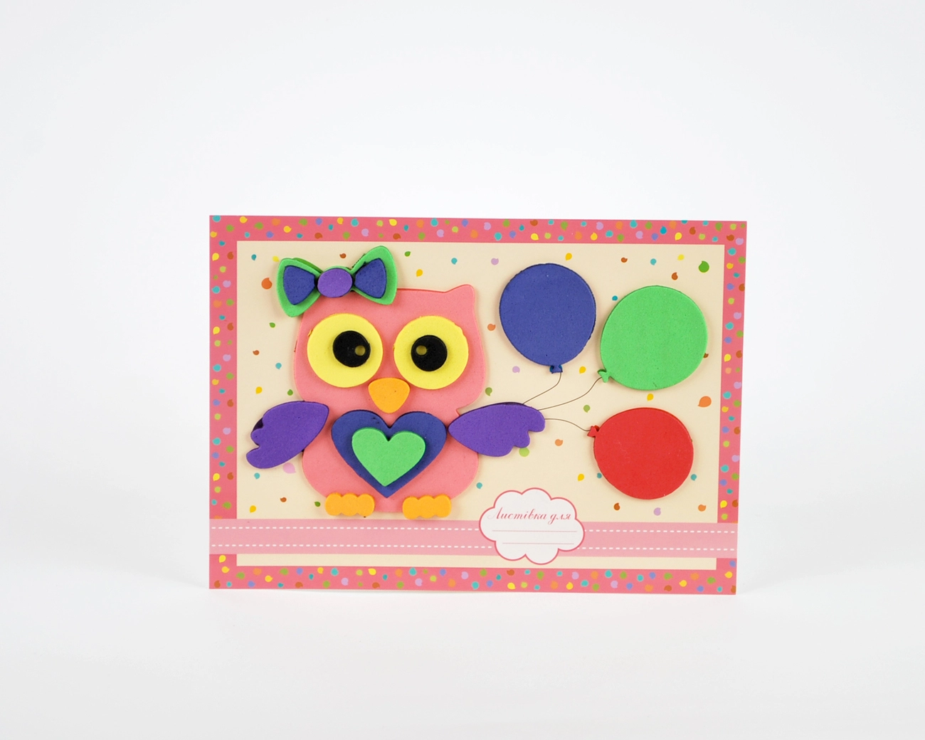 Аплікація-листівка "Сова" - це дитячий набір в який входить картонна листівка з нанесеним на неї контуром для підклеювання деталей. Також після поклейки композиції з дитиною можна її підписати в спеціальному полі.