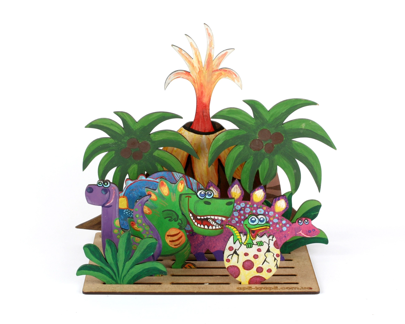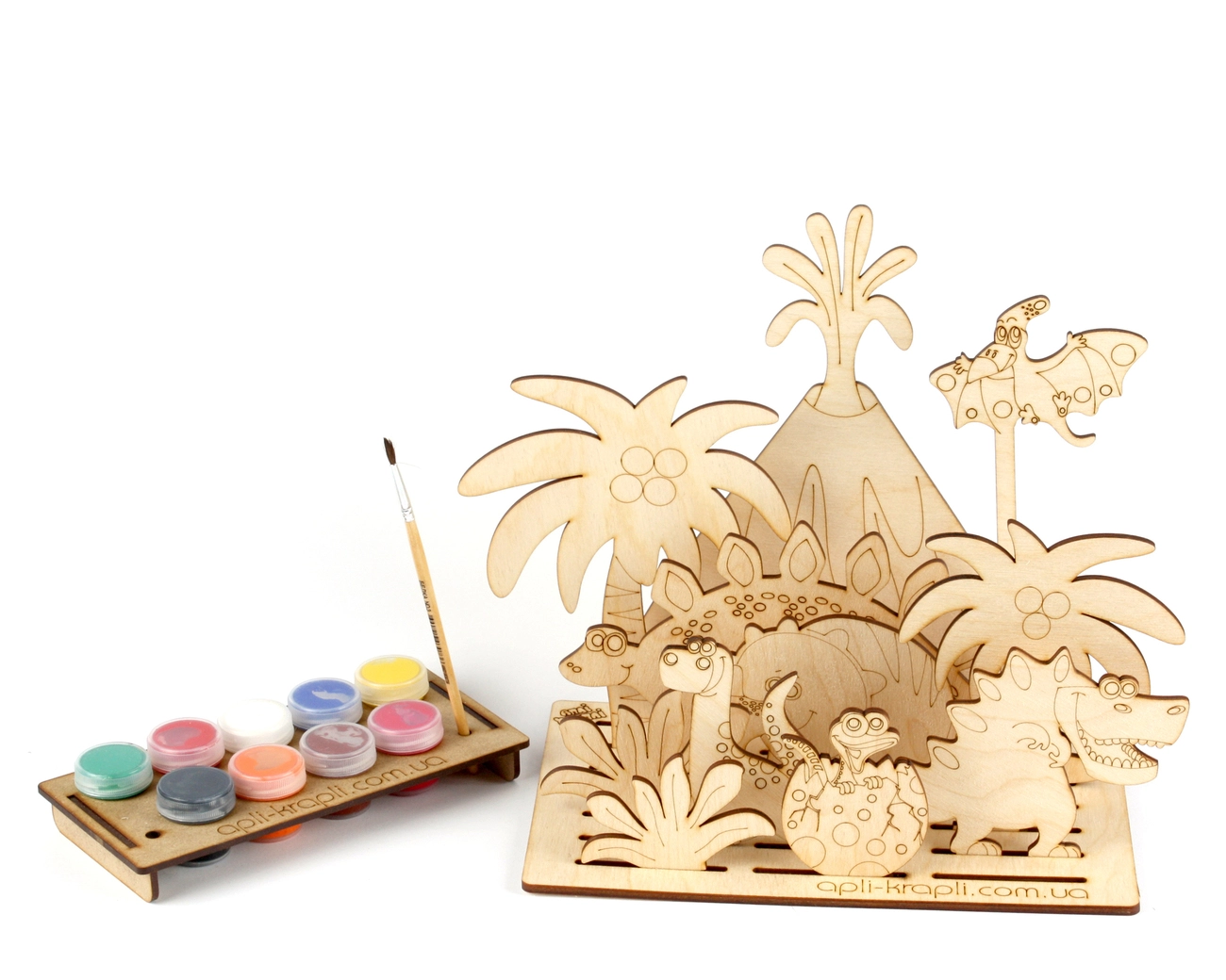 Набір для розмалювання з фанери "Епоха динозаврів" - це комплект фанерних деталей з гравіюванням які призначені для прикрашання, також в набір входять 9 гуашевих фарб і пензлик які організовані на підставці.Після розмальовки і висихання все герої композиції можуть бути розміщені на планшеті підставці.