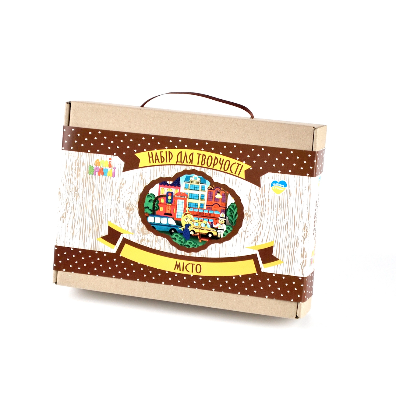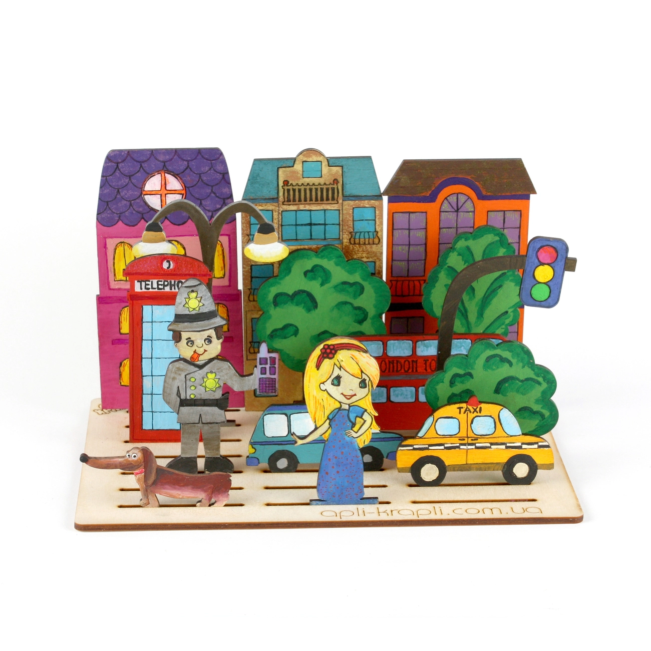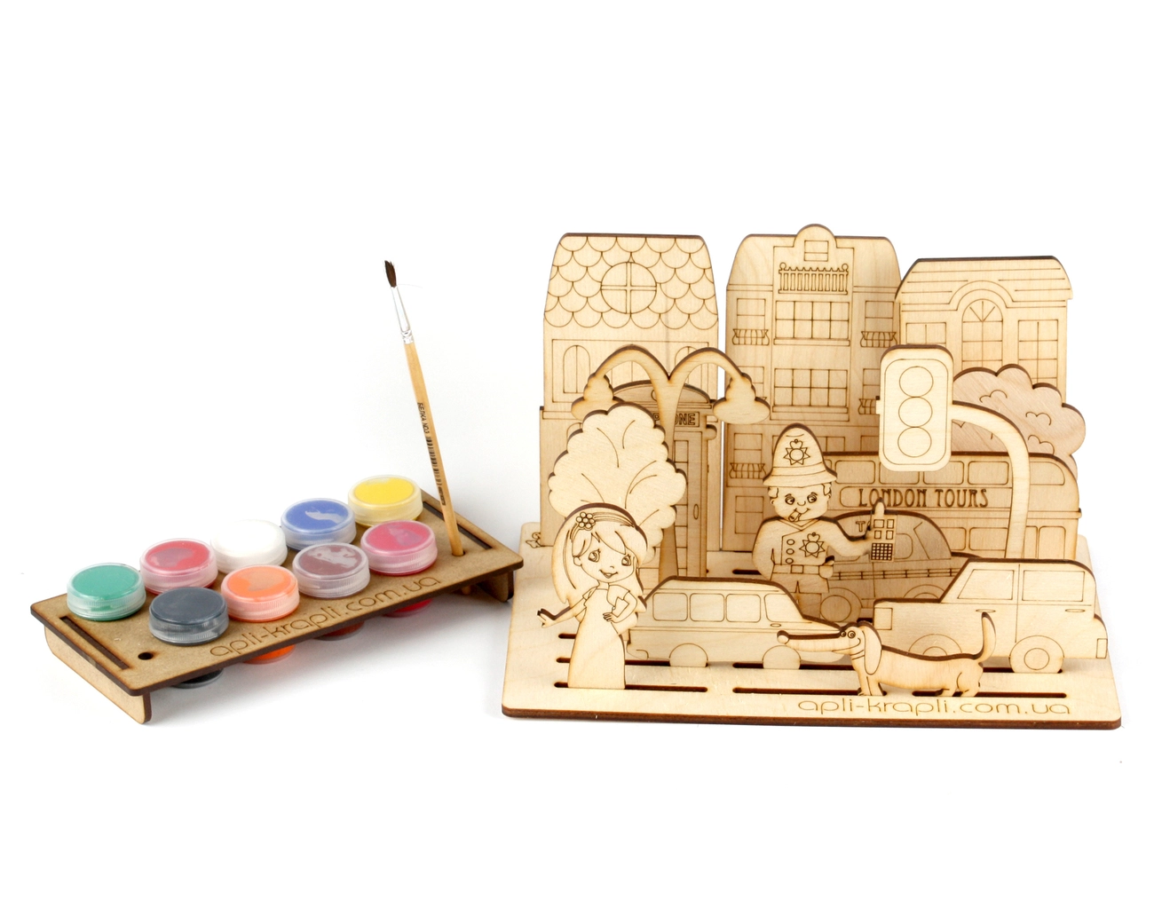 Набір для розмалювання з фанери "Місто" - це комплект фанерних деталей з гравіюванням які призначені для прикрашання, також в набір входять 9 гуашевих фарб і пензлик які організовані на підставці.Після розмальовки і висихання все герої композиції можуть бути розміщені на планшеті підставці.