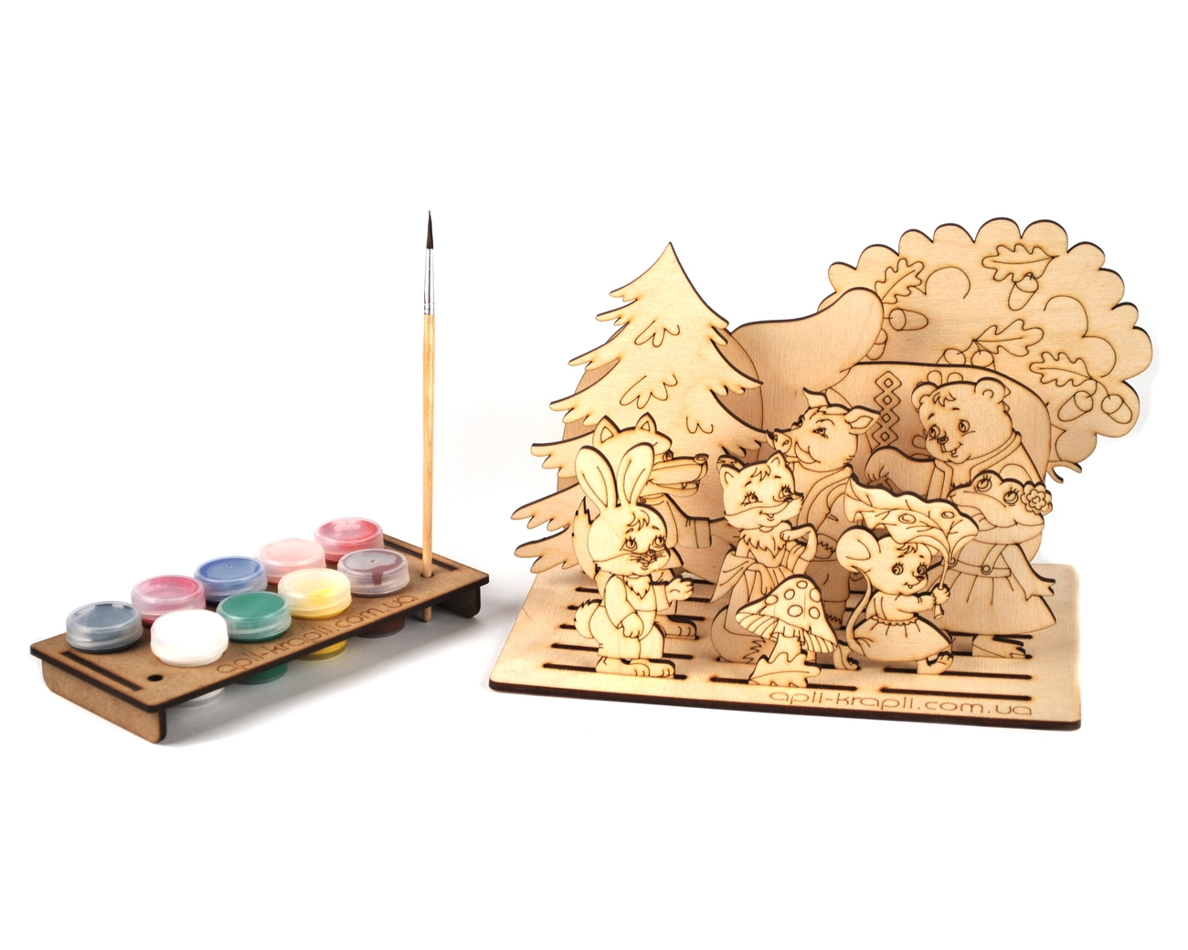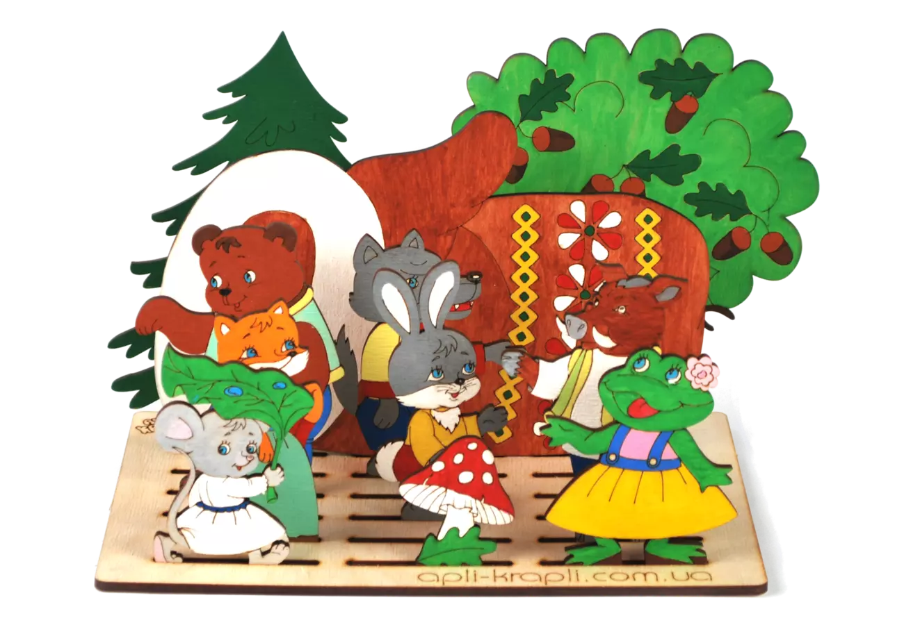 Набір для розмалювання з фанери "Рукавичка" - це комплект фанерних деталей з гравіюванням які призначені для прикрашання, також в набір входять 9 гуашевих фарб і пензлик які організовані на підставці.Після розмальовки і висихання все герої композиції можуть бути розміщені на планшеті підставці.