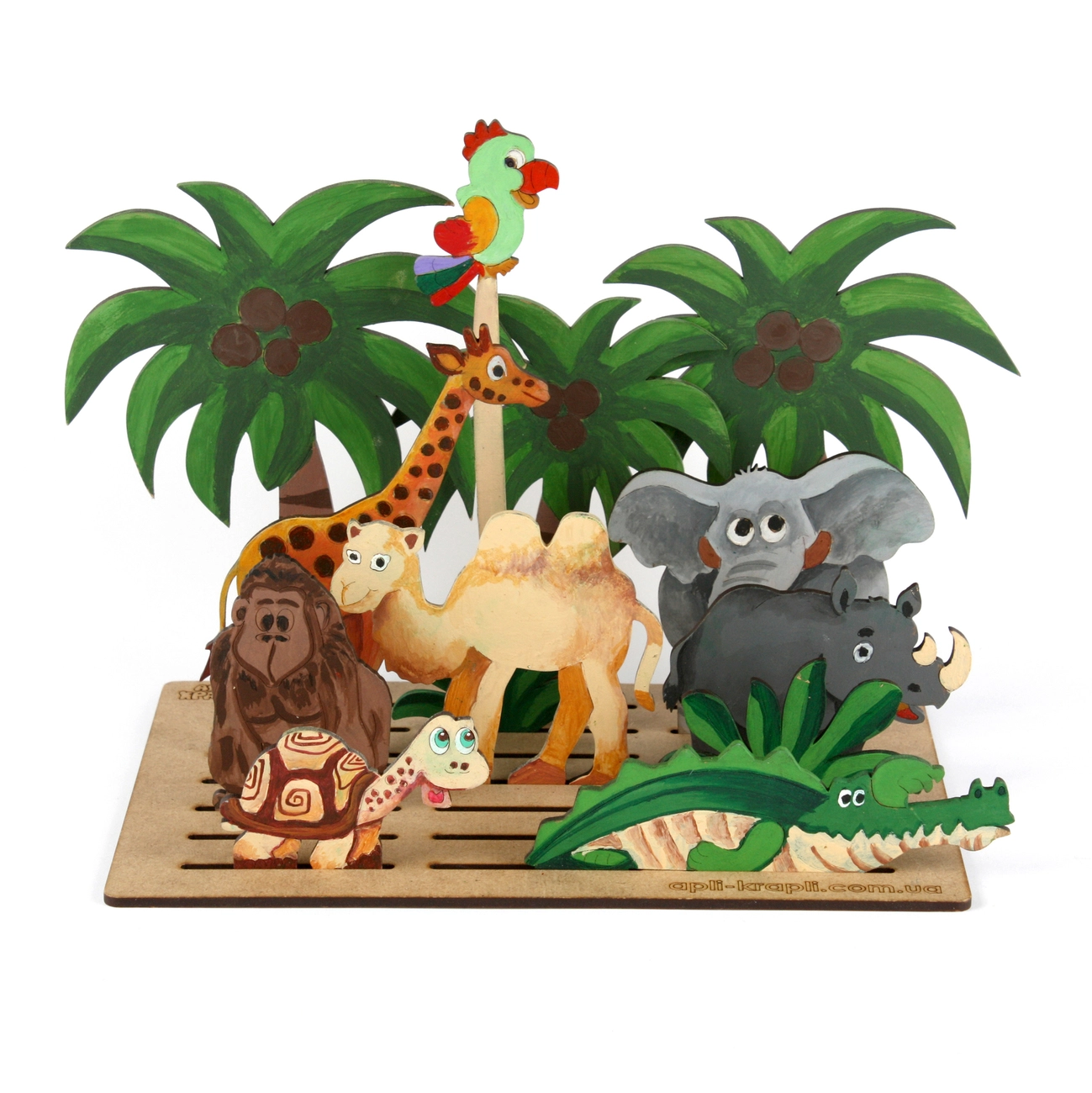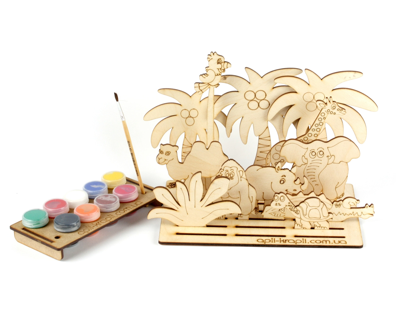 Набір для розмалювання з фанери "Сафарі" - це комплект фанерних деталей з гравіюванням які призначені для прикрашання, також в набір входять 9 гуашевих фарб і пензлик які організовані на підставці.Після розмальовки і висихання все герої композиції можуть бути розміщені на планшеті підставці.