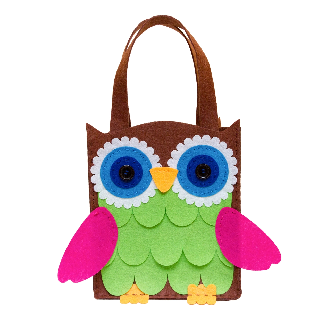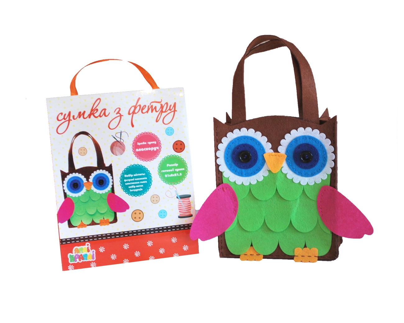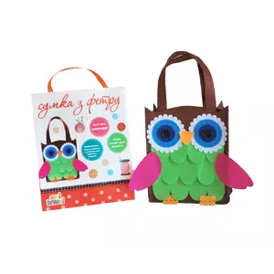 Фетрова сумка "Сова" - це набір деталей з фетру товщиною 1 і 2 мм з перфорацією для зшивання, також в комплекті йдуть різнокольорові нитки і пластикова голка. Сумка зшивається по інструкції (в комплекті).